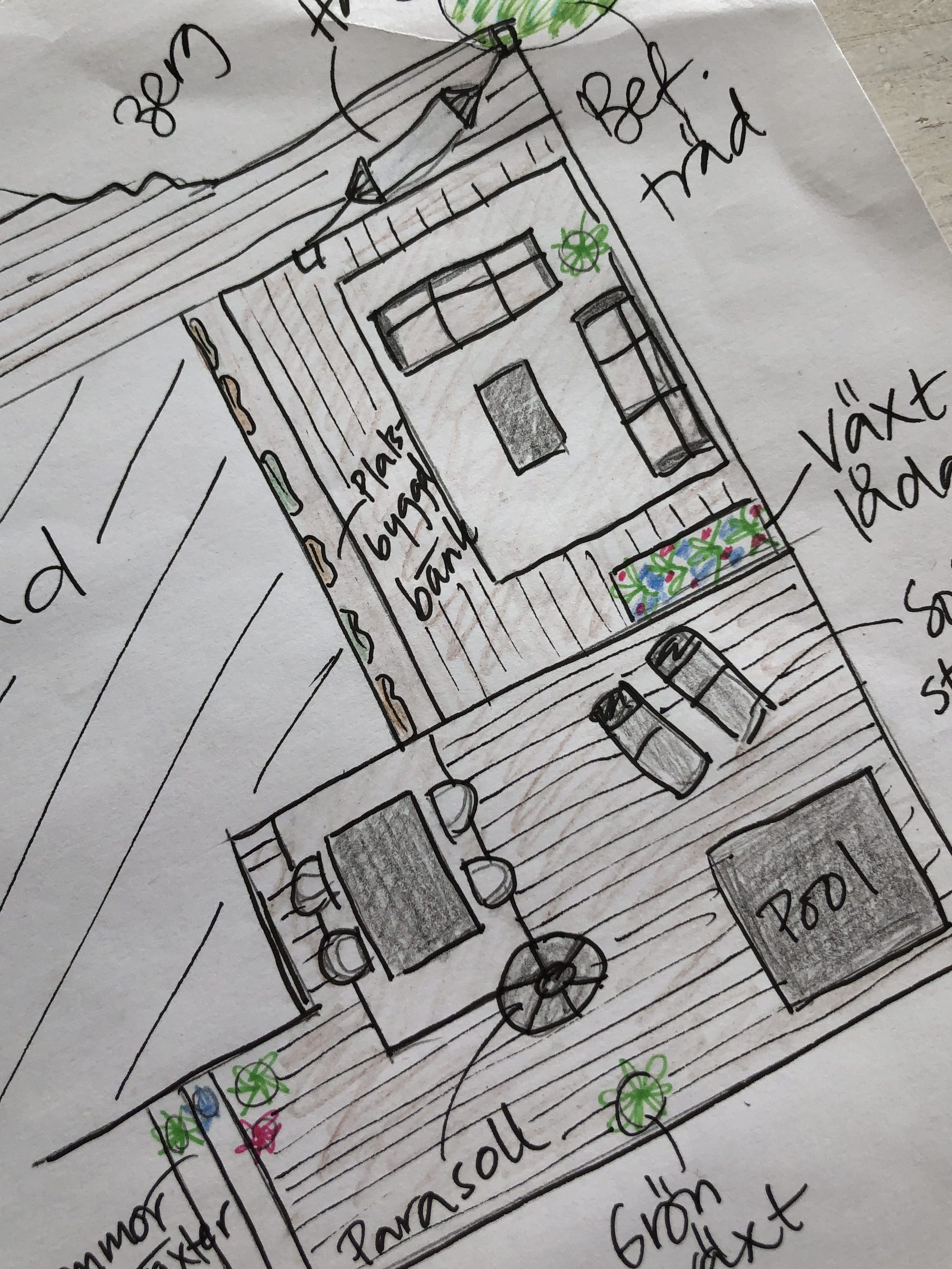 Därefter börjar mitt arbete med att ta fram ett förslag. Jag ritar upp miljön eller rummet, skalenligt i ett program på datorn. Ibland finns det satta förutsättningar och dessa ritas in redan från början. Dessa förutsättningar kan exempelvis vara ett växthus, träd eller buskar i trädgården som man vill utgå ifrån eller en öppen spis i ett rum som ska vara en central del. Utifrån dessa förutsättningar blir det lättare för mig att avgöra t.ex. var en trädgårdsgång passar in eller hur stor soffa eller matgrupp som får plats.