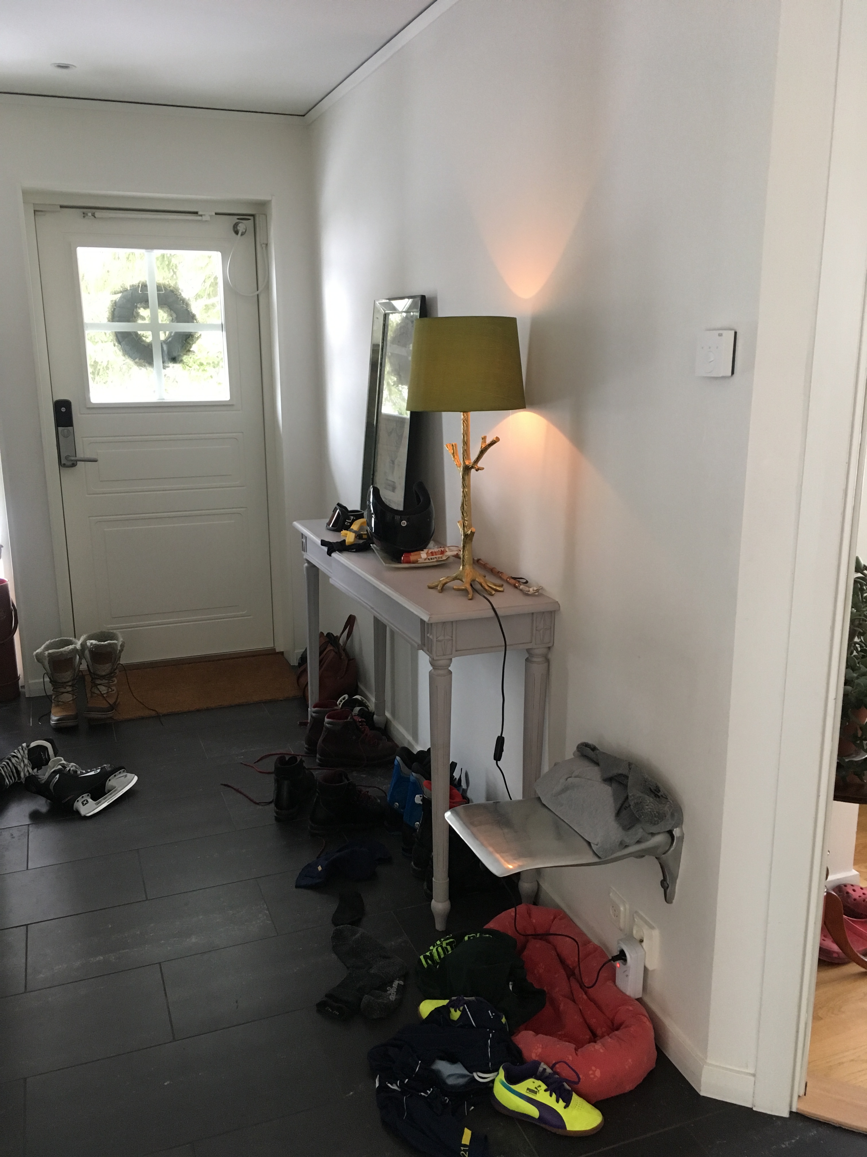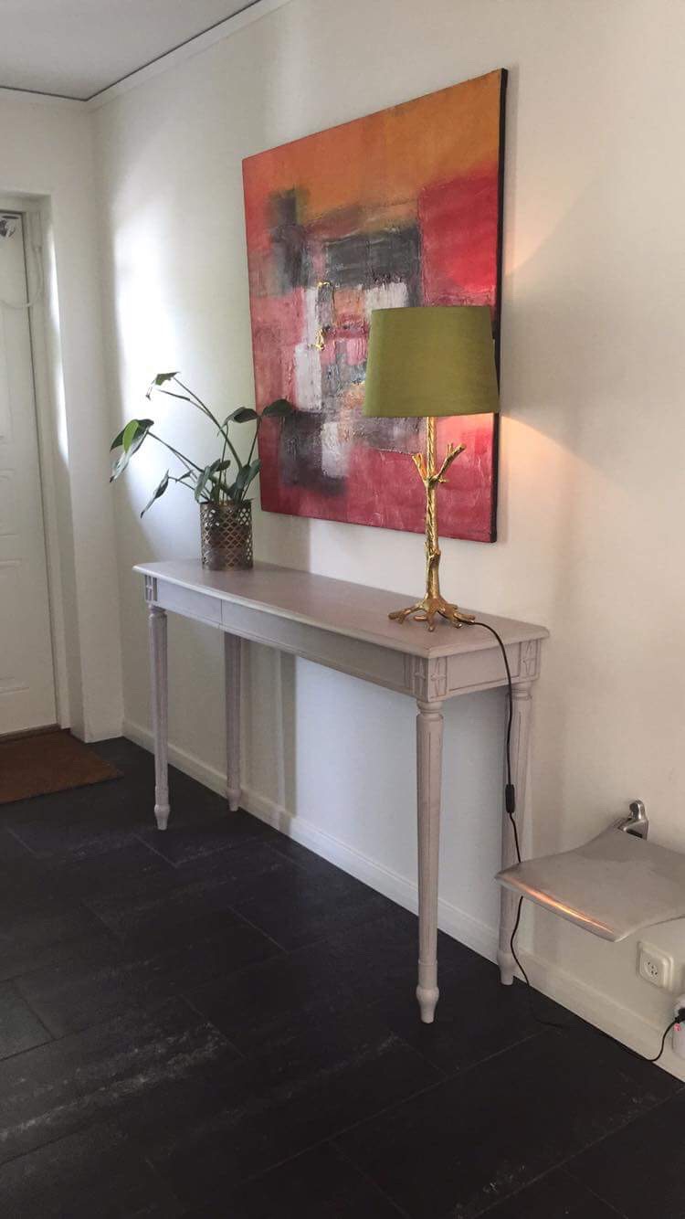 Med hjälp av att strukturera upp hallen, sätta upp en tavla, placera en växt på den vackra bänken, bidrar denna hall till en mer välkomnande, inbjudande och ombonad känsla när man kommer hem och öppnar dörren.