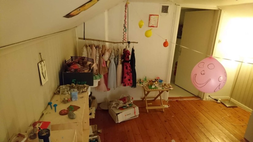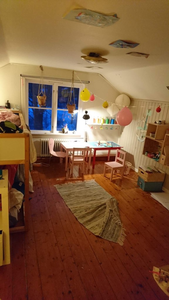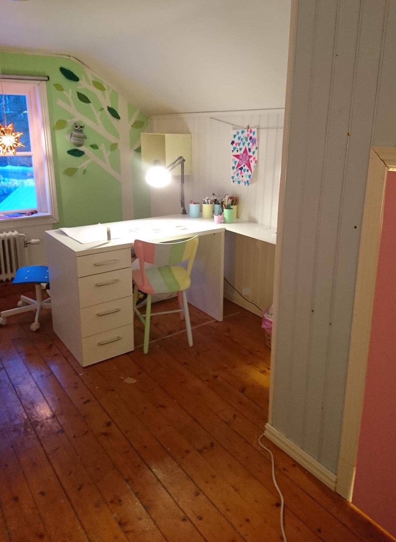 Här var utmaningen att med enkla medel göra ett inspirerande, mysigt och kreativt rum för en 6-årig tjej med pyssel som ett stort intresse. Efter inspiration och idéer från Sofia Breitholtz Inredning, byggde familjen ett litet mini-hus /kiosk/ affär i ena hörnet. Både som praktisk förvaring och ett mysigt kryp-in. För att få en känsla av högre takhöjd målades och pysslades ett lekfullt och spännande träd. Färgsättningen valdes med omsorg för att skapa lugn, harmoni och trivsel. Allt efter tjejens önskemål.