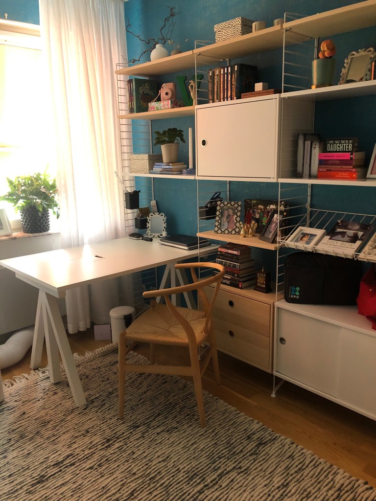 Här fanns önskemål om att få till bättre förvaring, göra det mysigare och mer funktionellt. Förvaringen löstes med hjälp av en String-hylla, byrå och en vintage garderob som köptes på 2:d hand.