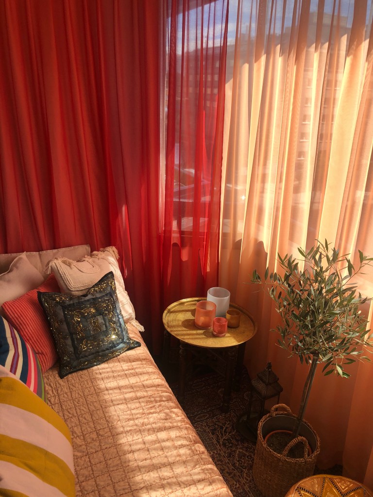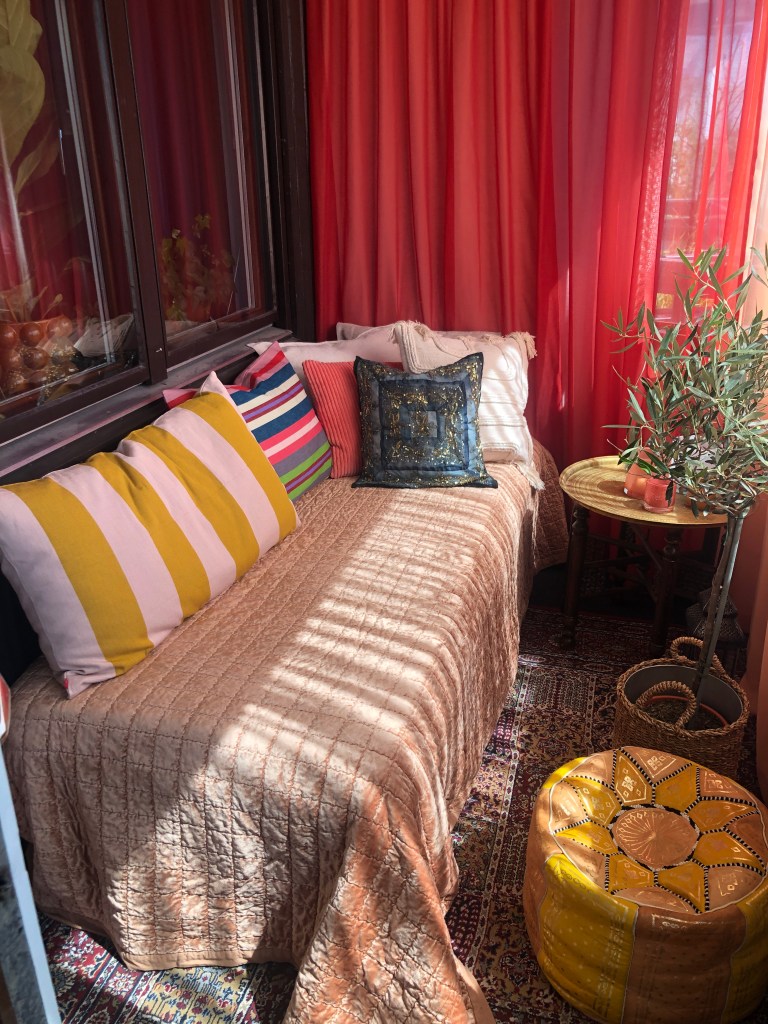 Här ville kunden få hjälp att skapa en riktigt mysig balkong, mycket färg, gärna lite marockansk känsla, gardiner och avkoppling.